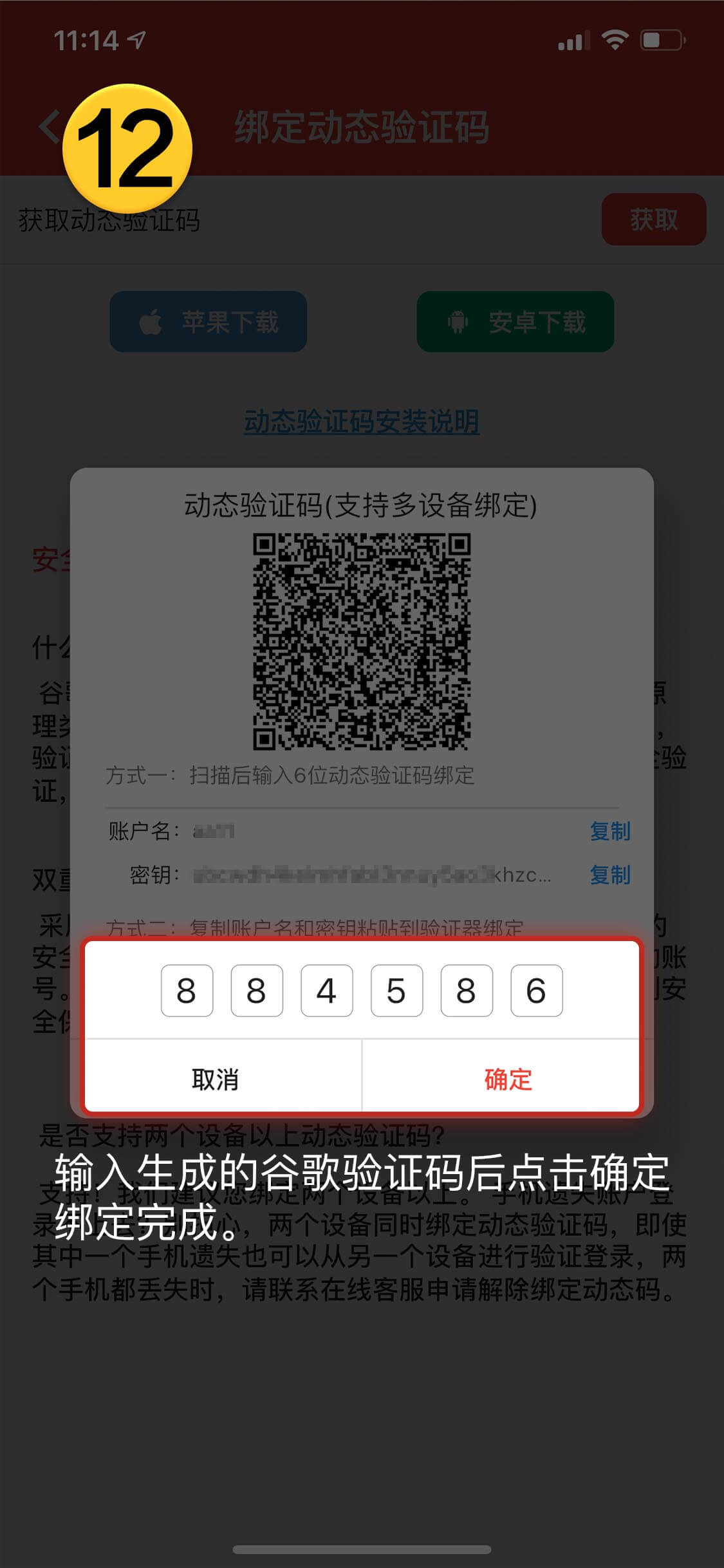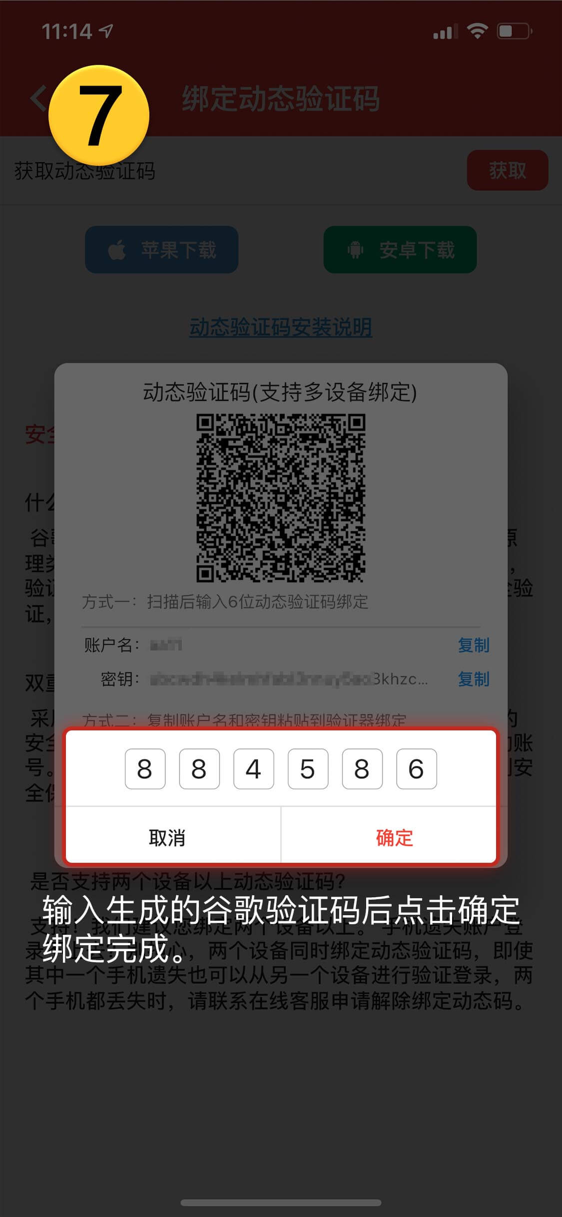 5、将6位数字的动态验证码复制粘贴到APP里确定后即可完成绑定。