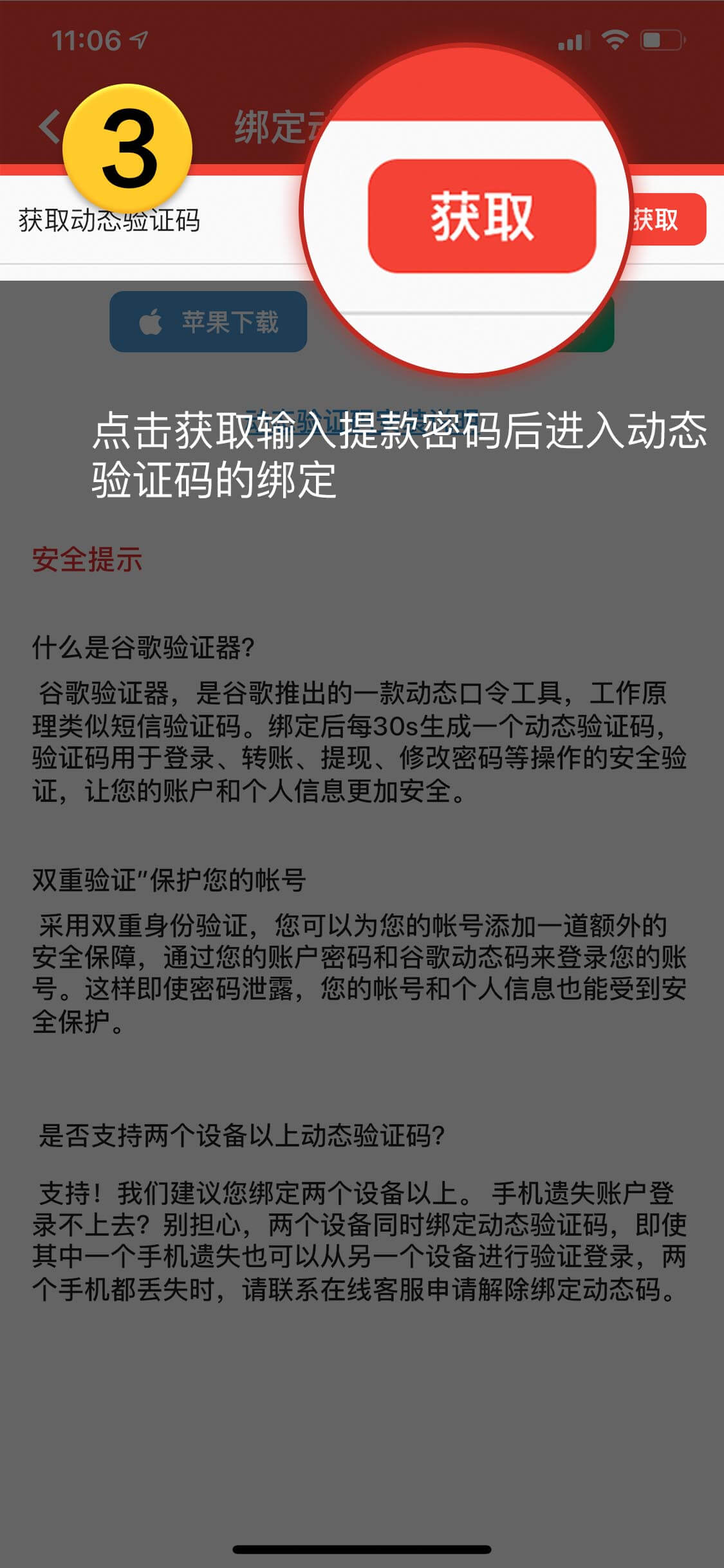 2、点击获取输入提款密码后进入动态验证码的绑定。
