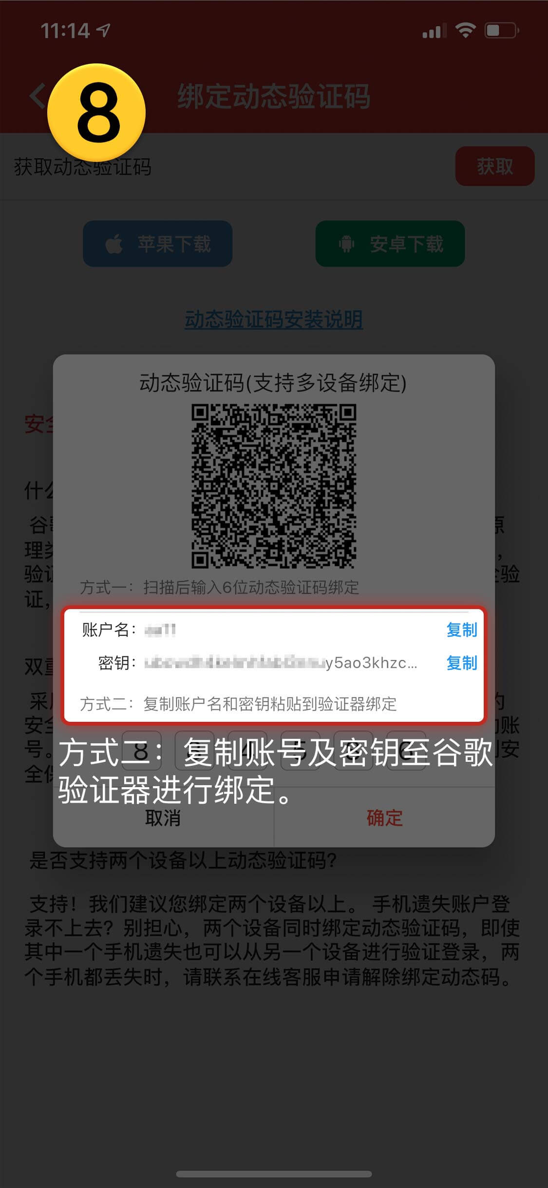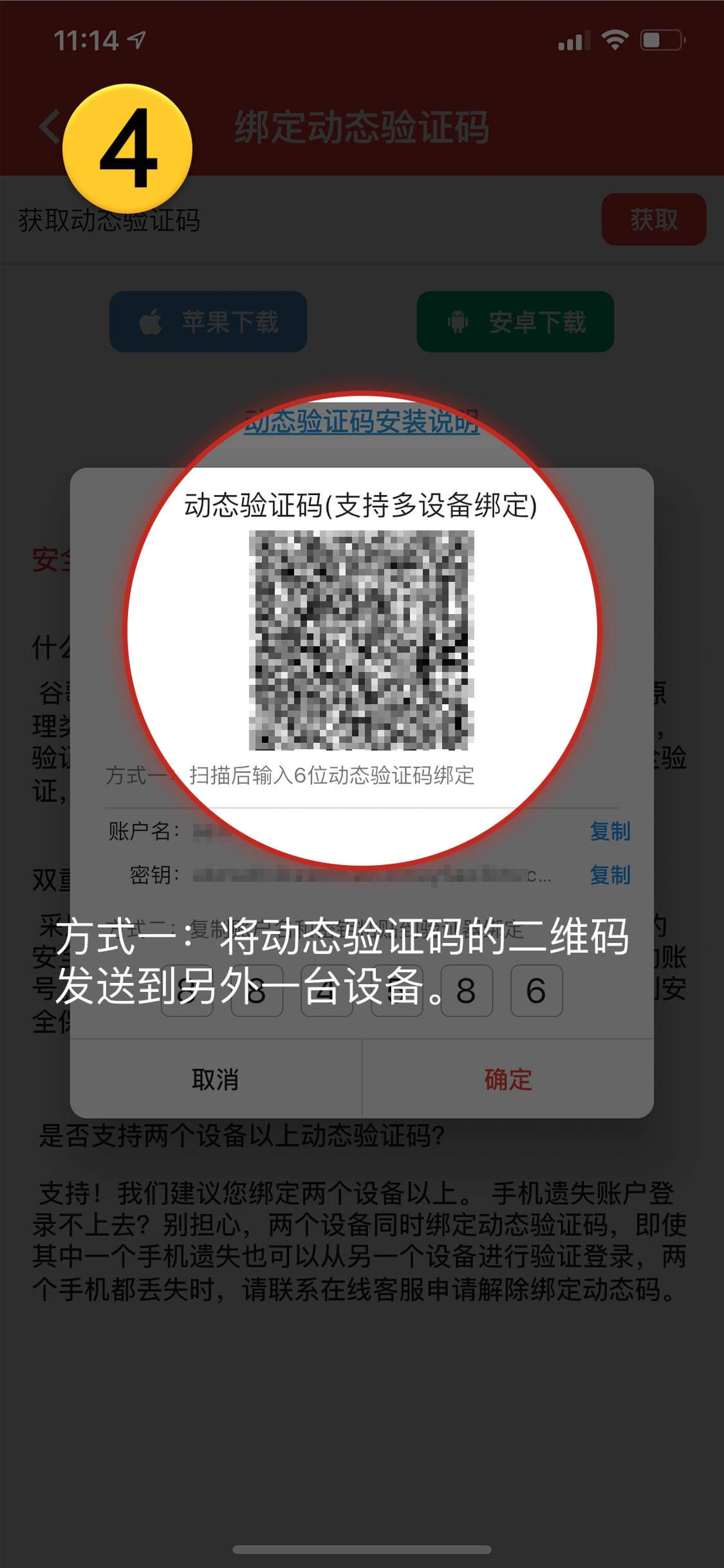 方式一:将动态验证码的二维码发送到另外一台设备,打开谷歌验证器APP进行扫码绑定。